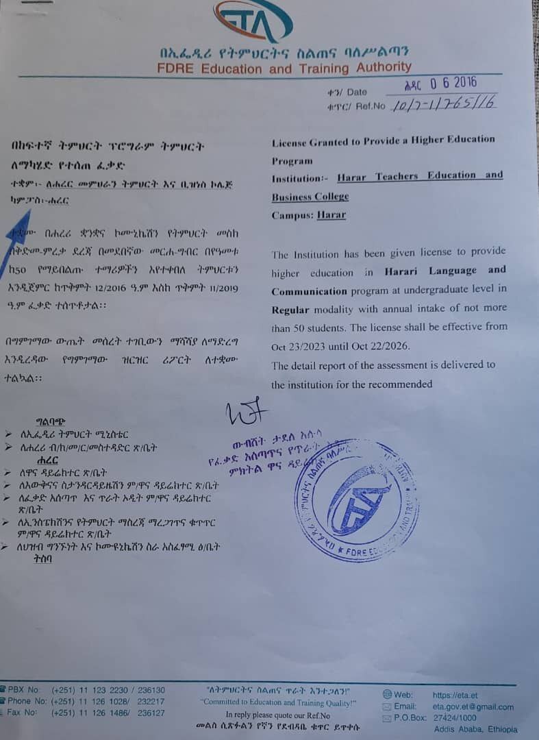In line with the country's educational training and development policy, Harar Teacher Education and Business College aims to produce teachers and employees who exhibit professional ethics and are capable of contributing to the development of the education sector. The college focuses on producing professionals equipped with the knowledge, skills, and dedication required to improve educational outcomes and drive progress in the region.